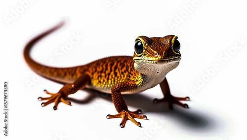 © DNA STUDIO, Fototapeta premium A vibrant orange gecko with large black eyes and intricate patterned skin poses on a clean white background