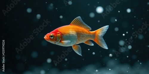 © Angel Pic, Fototapeta premium A vibrant orange goldfish gracefully swims through a dark aquatic environment, surrounded by a gentle flurry of tiny particles