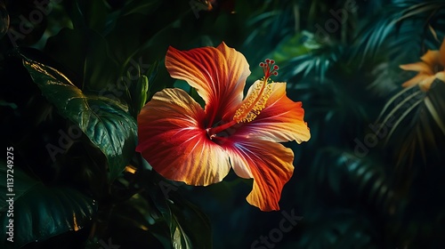 © siyons, Naklejka premium A vibrant orange hibiscus flower blooms in lush foliage