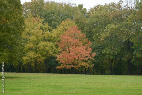 Naklejka premium A vibrant orange maple tree stands out among lush green foliage in autumn's...