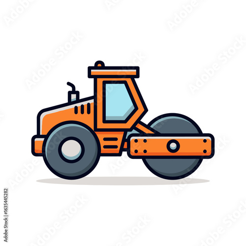 Fototapeta premium A vibrant orange road roller, depicted in a charming cartoon vector illustration style, stands ready for heavy-duty construction and paving work.