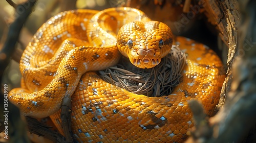 © Almazistock, Fototapeta premium A vibrant orange snake coiled in a nest among twigs, basking in sunlight in a lush environment
