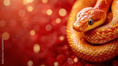 © muhamad, Fototapeta premium A Vibrant Orange Snake, Coiled On A Red, Bokeh-Filled Background. Its Scales Gleam, Creating A Striking Contrast.