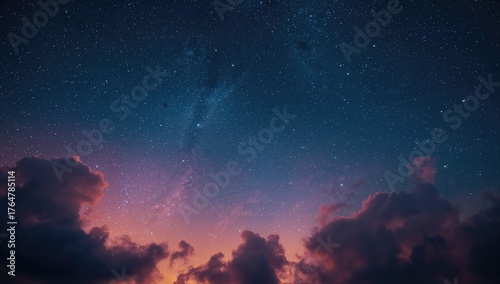 © vxnaghiyev, Naklejka premium A vibrant orange sunset under a deep blue sky filled with stars and clouds, created with generative AI tools