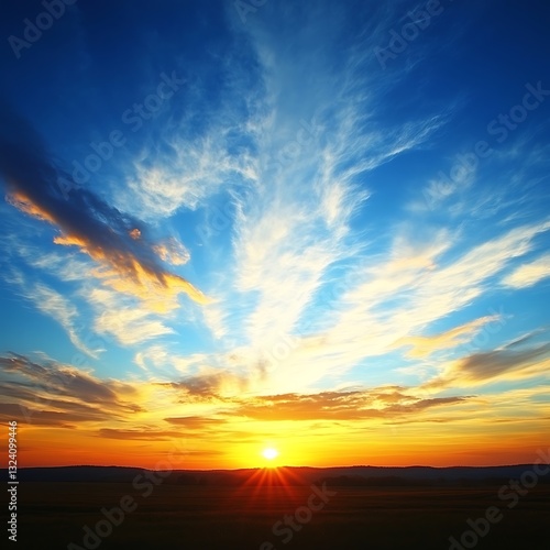 © yoks, Naklejka premium A vibrant orange sunset with blue sky and cloud formations