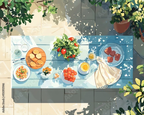 © Mind, Obraz premium A vibrant outdoor dining scene featuring fresh fruits, snacks, and drinks arranged beautifully on a sunny table.