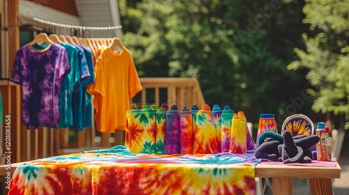 Fototapeta premium A vibrant outdoor tie-dye station with T-shirts, dyes, and gloves