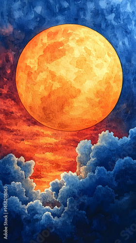 © abid, Obraz premium A vibrant, oversized moon dominates a fiery, cloud-filled sunset sky. Warm oranges and deep blues create a dramatic contrast