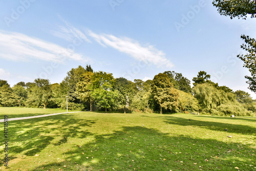 Naklejka premium A vibrant park scene showcasing a panoramic view of lush green grass and...