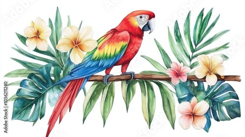 Fototapeta premium A vibrant parrot perched on a branch surrounded by tropical flowers and leaves.