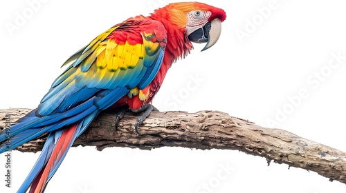 © Mr Studio, Fototapeta premium A vibrant parrot perched on a branch. The parrot is multicolored with a bright yellow head, a red body, and blue wings.