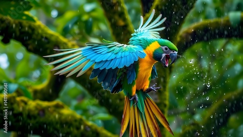 Fototapeta premium "A vibrant parrot shakes off rain, its iridescent feathers sparkling in the...