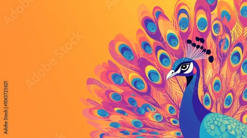 Fototapeta premium A vibrant peacock displaying its colorful feathers against a bold orange...