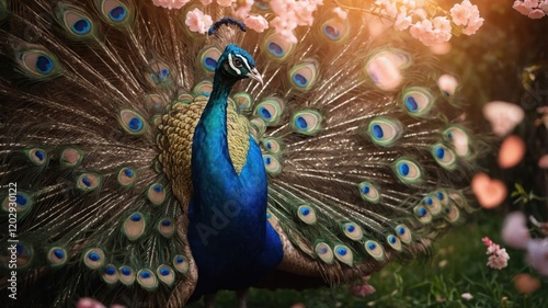 Obraz premium A vibrant peacock displaying its feathers amidst blooming flowers in a serene...