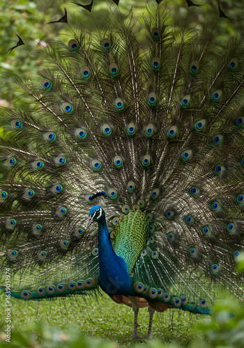 Obraz premium A vibrant peacock displaying its iridescent tail feathers, standing proudly...