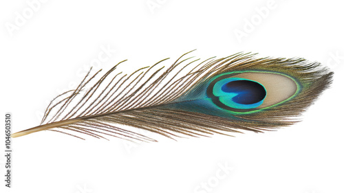 Fototapeta premium A vibrant peacock feather displaying iridescent colors against a transparent...