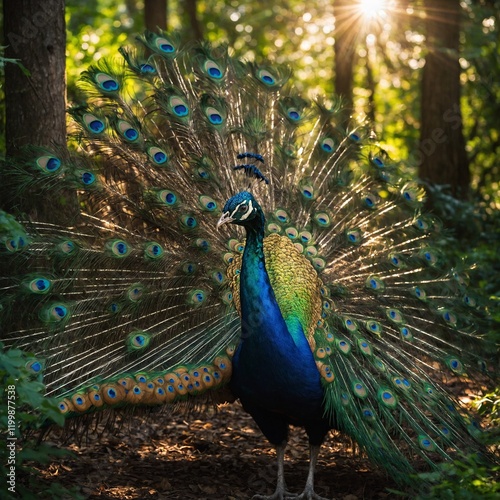 © Muhammad, Naklejka premium A vibrant peacock spreading its iridescent feathers, standing in a lush green forest with sunlight streaming through the trees.