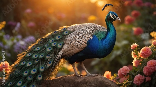 © Tina, Obraz premium A vibrant peacock stands amidst colorful flowers during sunset.