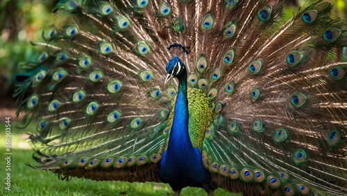 Obraz premium A vibrant peacock with its stunning tail feathers fully fanned out