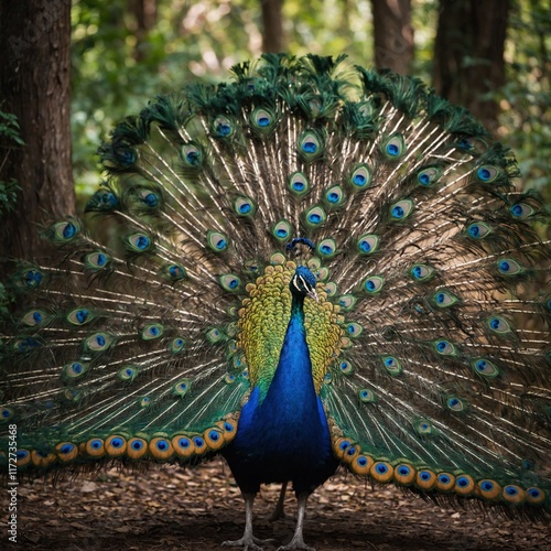 © Muhammad, Obraz premium A vibrant peacock with its tail fully fanned against a lush forest backdrop.
