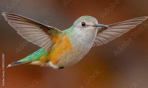 Fototapeta premium A vibrant Pharomachrus hummingbird flies, displaying its brilliant feathers...