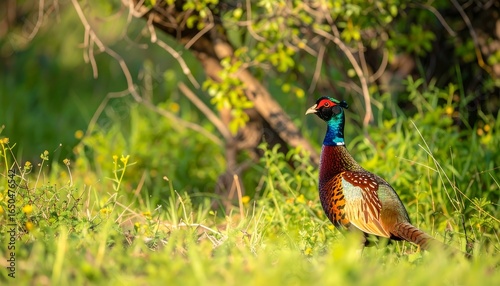© Fafa, Obraz premium A vibrant pheasant stands in a grassy field, sunlight illuminating its plumage