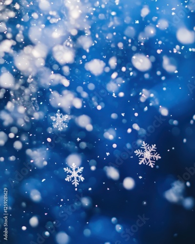 Obraz premium A vibrant photo of snowflakes falling gently against a deep blue sky,...