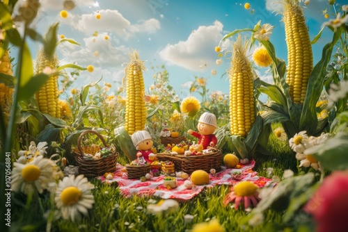 Fototapeta premium A vibrant picnic scene with cute characters surrounded by flowers and corn. This image showcases a joyful summer moment filled with fun and nature. Generative AI