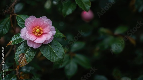 © The 2R Artificiality, Fototapeta premium A vibrant pink camellia bloom on the bottom left, accompanied by a rain-soaked leaf with a blurred green foliage backdrop
