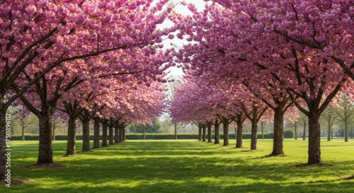 Naklejka premium A vibrant pink cherry blossom tunnel frames a lush green lawn and a distant...