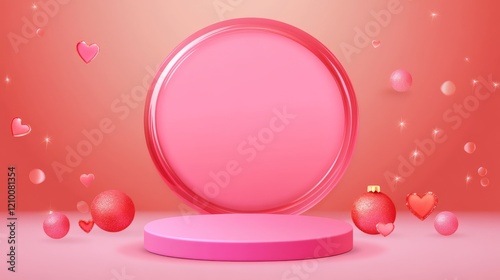 Obraz premium A vibrant pink display platform surrounded by floating hearts and spheres,...