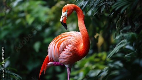 Fototapeta premium A vibrant pink flamingo stands gracefully in a lush green environment