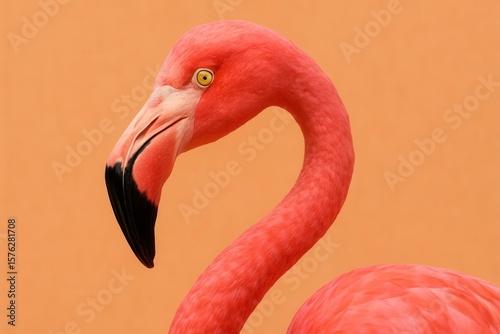 © Oleg, Obraz premium A vibrant pink flamingo stands out against a warm orange backdrop, its striking eyes capturing attention