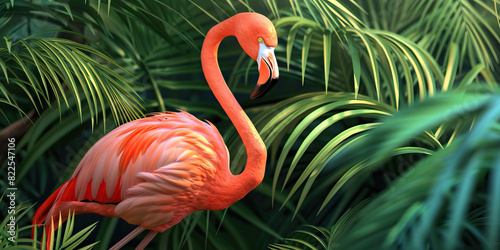 Fototapeta premium A vibrant pink flamingo stands tall amidst the lush greenery, reflecting on its tropical surroundings.