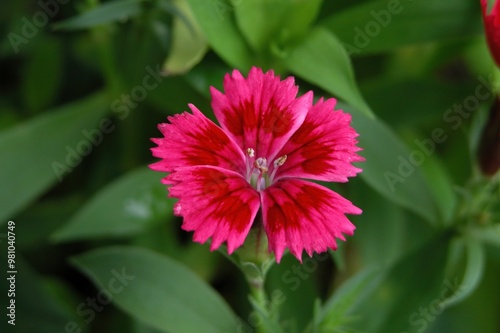 © SATRIANANGISAN, Fototapeta premium A vibrant pink flower with fringed petals surrounded by green foliage.