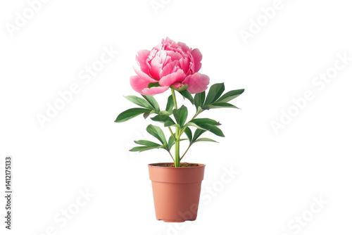 © BANO'S, Obraz premium A vibrant pink peony blooming in a simple terracotta pot on a soft gray background isolated on transparent background