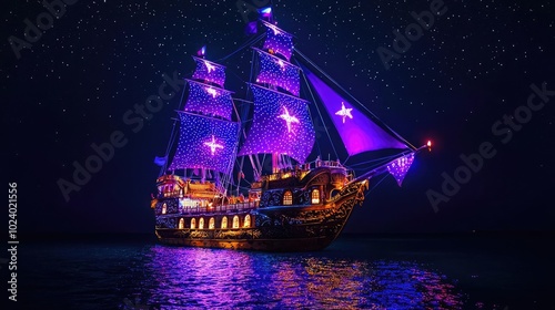 © Jiraporn, Naklejka premium A vibrant pirate ship illuminated by dazzling lights, gliding over calm waters under a starry night sky.