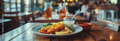 © S photographer, Fototapeta premium A vibrant plate of fried fish with sides of fresh lemon, coleslaw, and dipping sauces on a rustic wooden table.