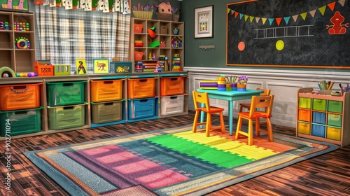 Naklejka premium A vibrant playroom with colorful storage bins, a large play mat, a small table and chairs for crafts, and a chalkboard wall.