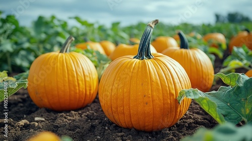 Fototapeta premium A vibrant pumpkin patch with ripe pumpkins ready for harvest.