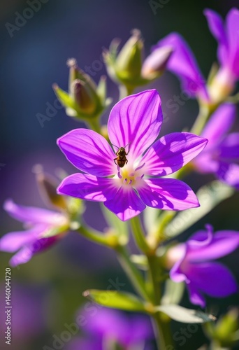 Fototapeta premium A vibrant purple flower, delicately adorned with a tiny insect, garden,...