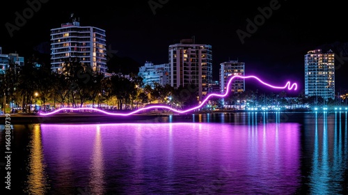 © Berkah1789, Fototapeta premium A vibrant purple light installation reflecting on the water at night in a coastal city.