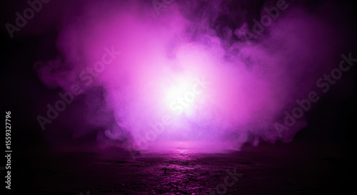 Fototapeta premium A vibrant purple smoke fills the dark space, creating an ethereal and mysterious atmosphere with a bright light source