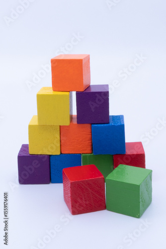 © Leo, Fototapeta premium A Vibrant Pyramid of Wooden Blocks with Loose Cubes on a White Background