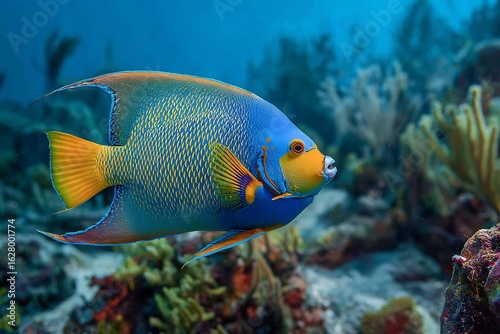 Naklejka premium A vibrant queen angelfish swimming in the ocean near coral reef formations in...
