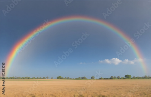 © joeycheung, Obraz premium A vibrant rainbow arches across a clear, blue sky above a golden field. The image showcases nature's beauty, a peaceful landscape.