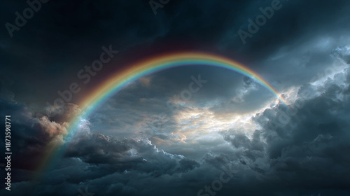 © Thiago, Obraz premium A vibrant rainbow arches across a dramatic sky, symbolizing hope after the storm