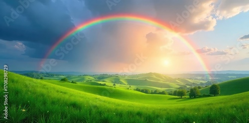 Obraz premium A vibrant rainbow arches gracefully over a tranquil landscape, casting colorful light on rolling hills and lush green fields Perfect for nature, weather, and serenity themes , vibrant, colors