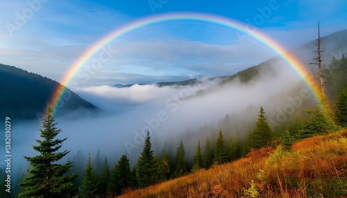 Naklejka premium A vibrant rainbow arches majestically across a scenic mountain landscape, with lush forests and mist-covered valleys
