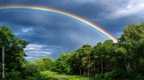 Naklejka premium A Vibrant Rainbow Arches Over a Lush Forest after Rain